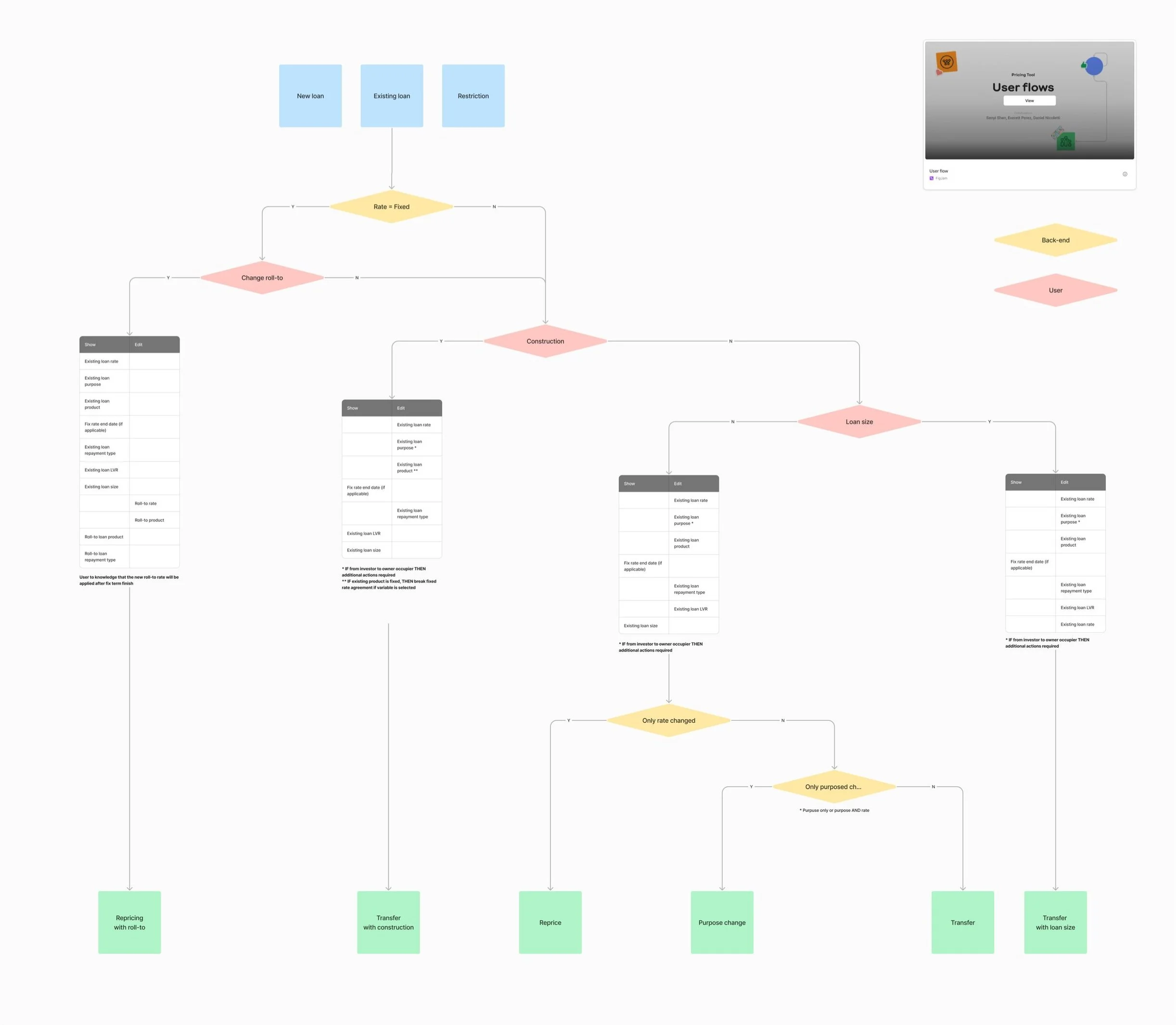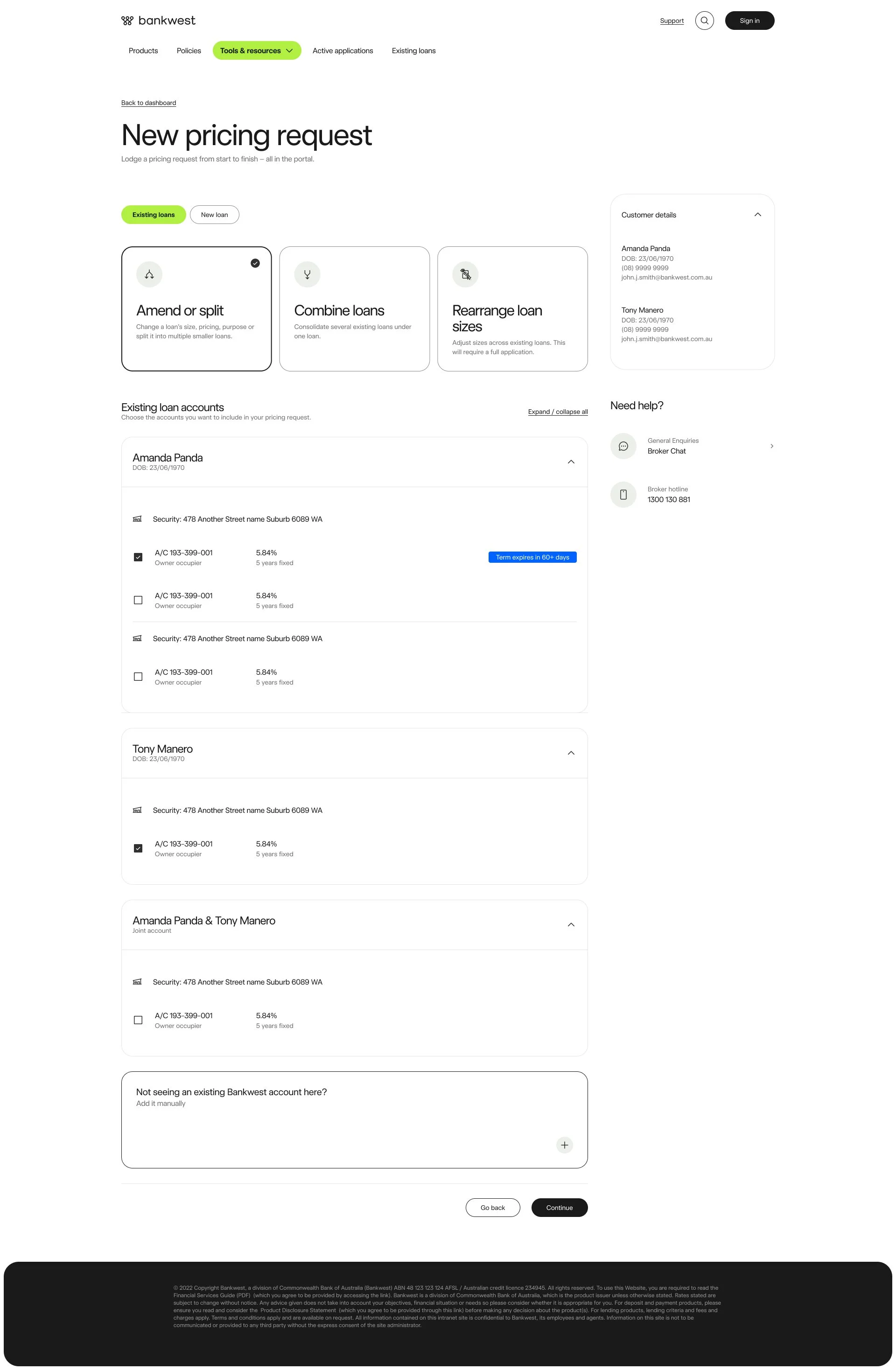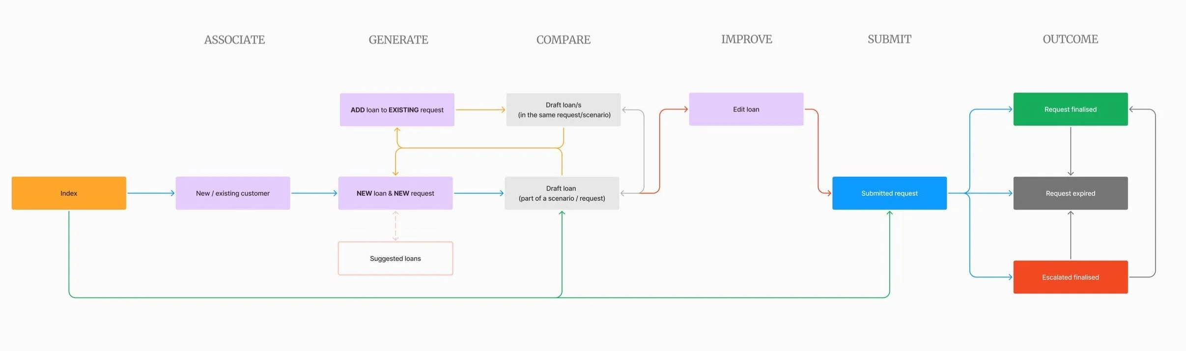 Intelligent request type determination. The existing pricing tool requires brokers to select the type of pricing request (transfer, repricing, or purpose change). However, brokers often choose the wrong type, leading to incorrect requests and inefficiencies. To address this issue, the new design allows brokers to select the characteristics of the loan based on their preferences, such as the loan amount, LVR, and loan purpose. The system then intelligently determines the appropriate request type based on the provided parameters. This approach eliminates the need for brokers to manually select the request type and reduces the risk of errors, ultimately streamlining the pricing request process and improving accuracy.