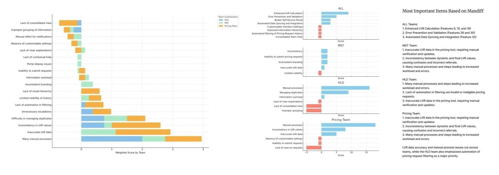 The MaxDiff survey helped to identify the most critical issues and desired features for the Pricing Tool from the perspective of both brokers and internal teams. By augmenting the MaxDiff results with the persona-based segmentation from the initial profiling questions, the survey provided a more nuanced understanding of the priorities and needs of different user groups.