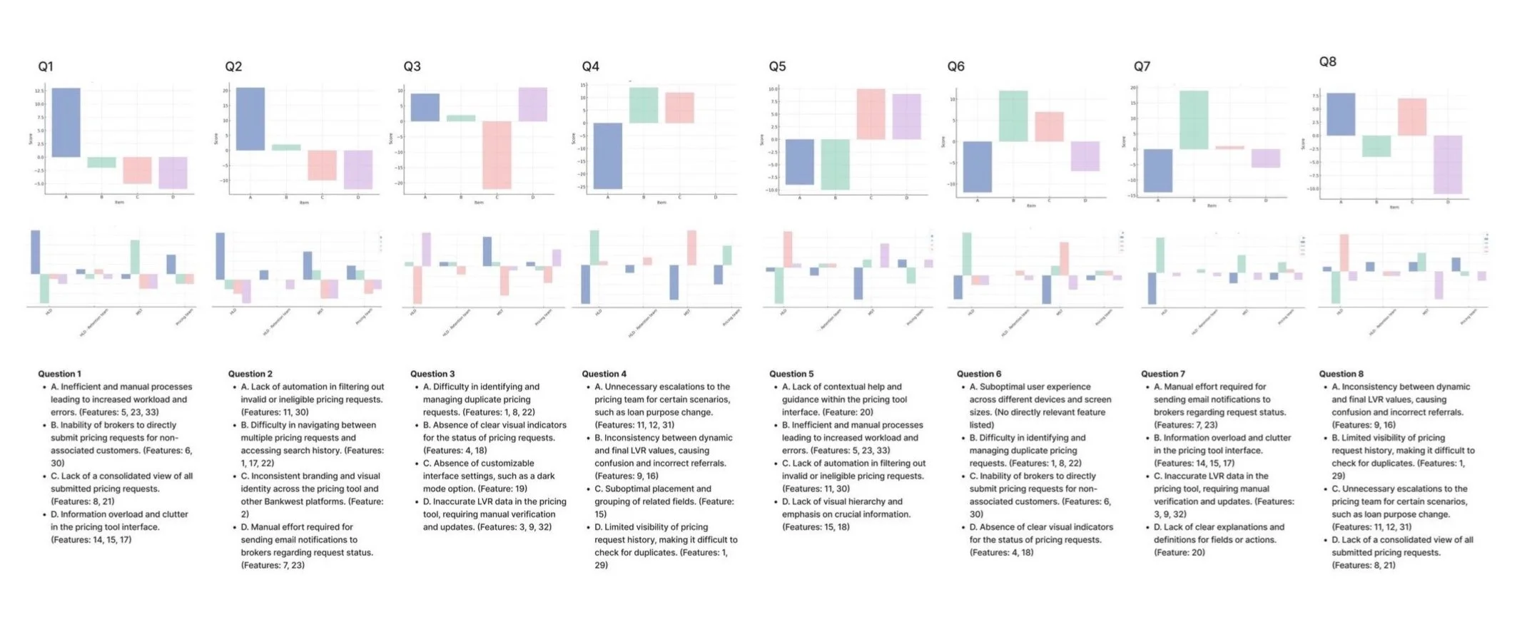 By combining qualitative data from the workshops, quantitative data from the persona-augmented MaxDiff survey, and benchmarking data from the business dashboard, the discovery phase aimed to provide a comprehensive understanding of the needs, challenges, and preferences of brokers and internal teams, as well as the current performance of the pricing request process. This holistic approach ensures that the proposed design solutions are grounded in user insights, aligned with business objectives, and measurable against established benchmarks.