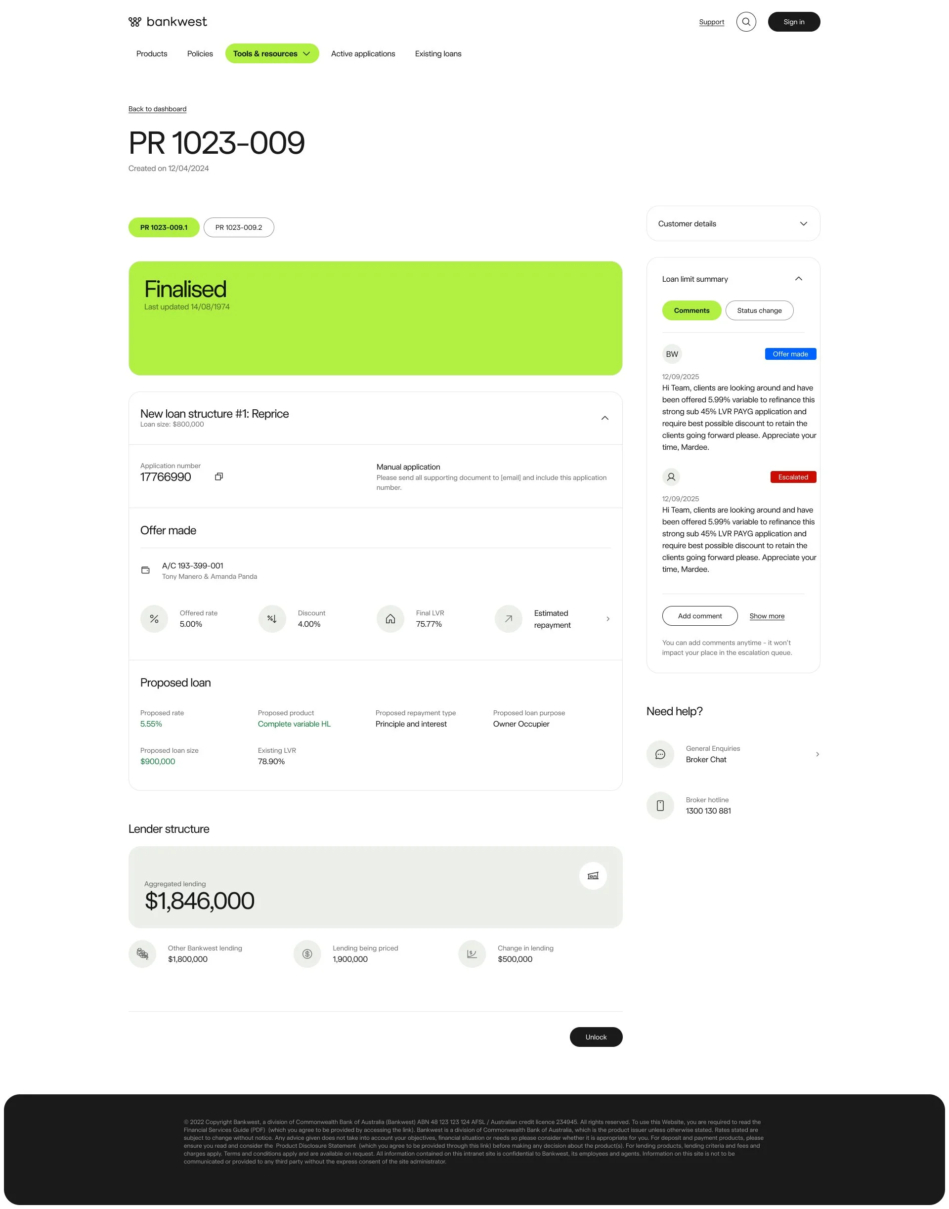 Redesigned information architecture. The information architecture (IA) of the Pricing Tool is redesigned to ensure that related data points are grouped together logically, making it easier for users to find and process the information they need. Key loan details, such as loan size and LVR, are now presented in a cohesive manner, allowing team members to quickly assess the loan's characteristics. Additionally, the redesigned IA incorporates loan fixed rate expiry and interest-only (I/O) end dates, providing the team with a comprehensive view of the loan's timeline and enabling them to make informed decisions. By having all the required information in one place, the team can work more efficiently and effectively, reducing the need to navigate through multiple screens or systems to gather the necessary data.